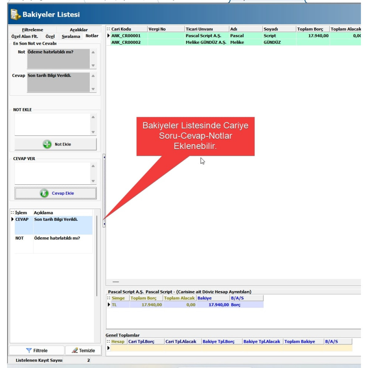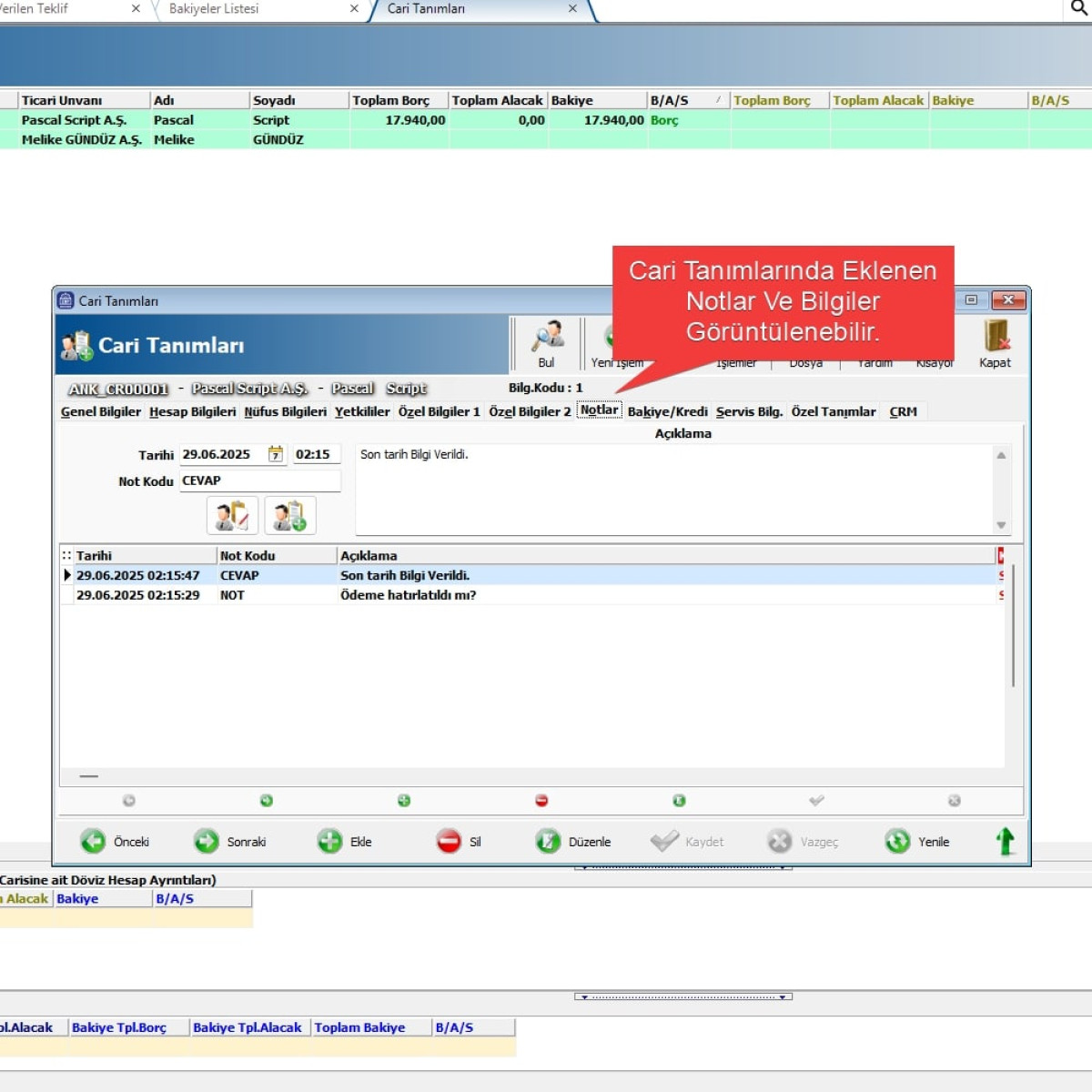 - Her bir cari için geçmişe dönük iletişim notları, sorulan sorular ve alınan cevaplar sistematik şekilde kaydedilir.