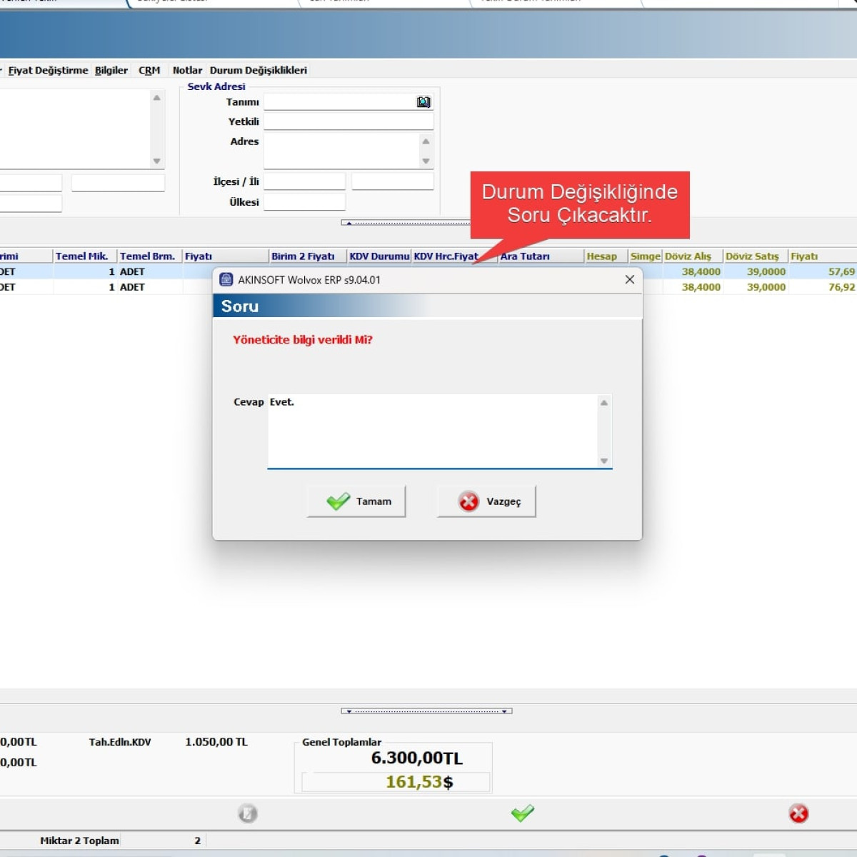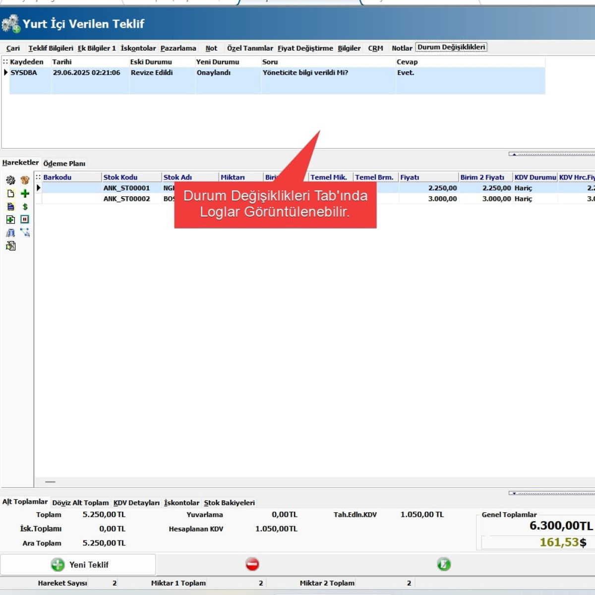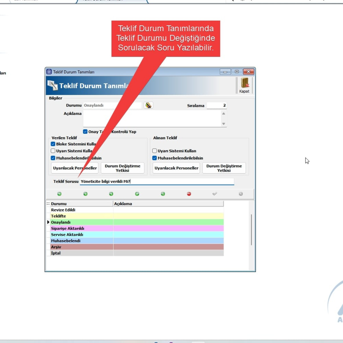 - Teklif durumları (örneğin: "Onaylandı", "Muhasebeleştirildi", "Beklemede" vb.) her değiştirildiğinde sistem, o duruma özel olarak tanımlanmış soru veya kontrol kutusunu otomatik olarak gösterir.